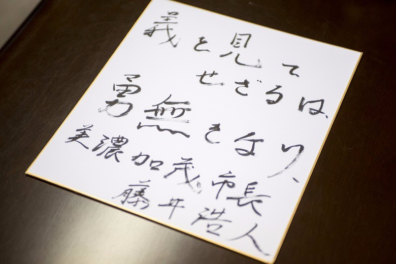 色紙に書いた「義を見てせざるは勇無きなり」。まだまだ立ち向かうべき課題は多いと語るが、支援者や役所の方をはじめとする多くの支えを受けながら、美濃加茂市を明るい未来に導くべく、藤井市長は懸命に前に進むだろう。同じ岐阜県民として、こういうリーダーがいることを誇りに感じると共に少し羨ましくも思った。そして、機会を頂戴した関係者の皆様に心から感謝したい。